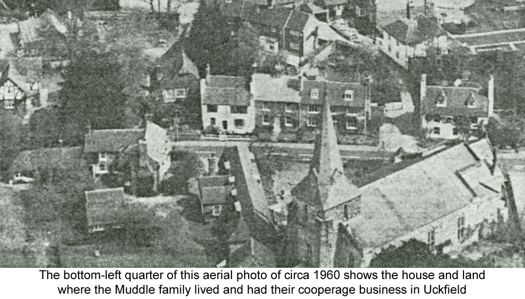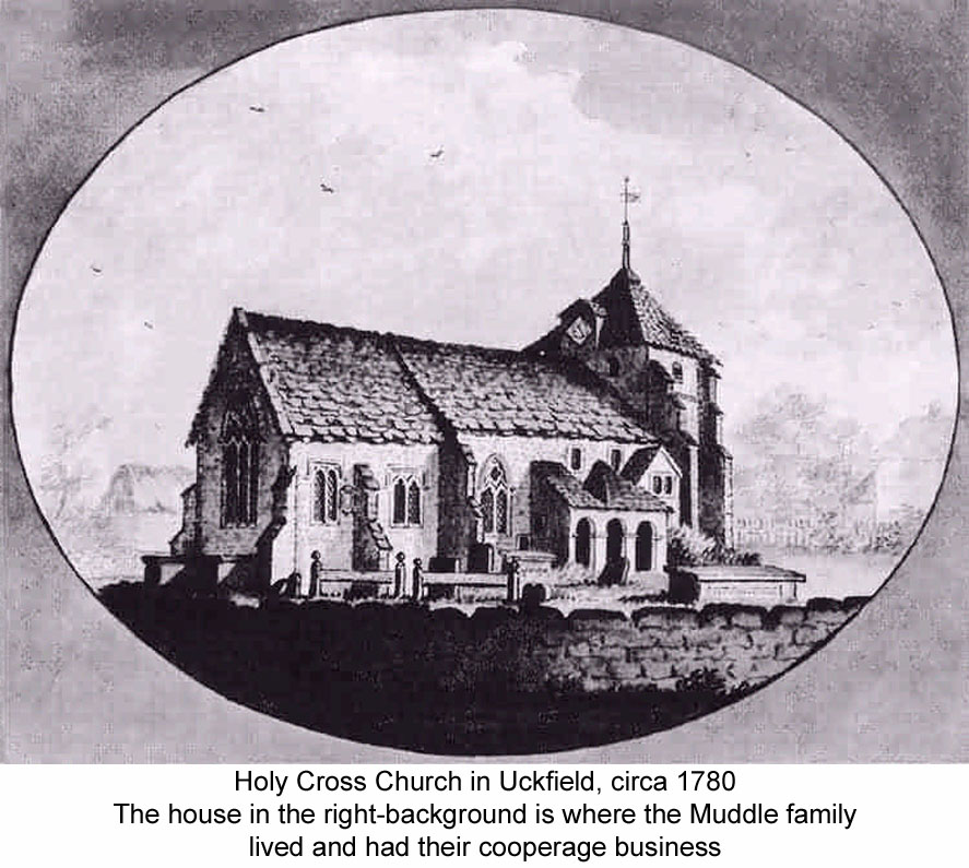 It's not known if William moved to Uckfield to work as a journeyman cooper for the Ward family's established Uckfield cooperage business, or if he setup his own business in competition to the Ward family, but after moving to Uckfield William and Anne had three more children born between 1748 and 1756. Then after nearly 27 years of marriage Anne died at Uckfield and was buried in Holy Cross Churchyard at Uckfield on 4 June 1772. Then just over two months later William, at the age of 52, married Elizabeth Wicks, who was from Buxted, at Holy Cross Church in Uckfield on 20 August 1772 by licence. There were no children from this marriage, and they were together for 14½ years until Elizabeth died at Uckfield, and was buried in Holy Cross Churchyard at Uckfield on 28 April 1787. Eighteen months after his second wife's death, at the Court of the Manor of Framfield held on 27 October 1788, it was recorded that William Muddle, a cooper of Uckfield, had purchased from Thomas Dennett, William Piper and his wife Elizabeth, one messuage or tenement, one barn and other buildings with the orchard and lands thereto belonging, laying to the Churchyard of Uckfield, containing 2 roods and 16 perches, being bondland of the Yard of Bush. That this land was described as being part of the Yard of Bush indicates that it was probably land cleared for farming in very early times and owed by a man called Bush; a yard of land being a virgate, which is about 30 acres. William Muddle was admitted to these premises on payment of a fine of 3s 9d to the Lord of the Manor. At the same court William then mortgaged this property to Robert Durrant for £240 at 5% interest. From at least 1727 various members of the Ward family, who were coopers, had owned this property. When Edmund Ward died in 1786 his daughter Elizabeth, who had married William Piper, and Thomas Dennett, who had been married to Sarah Ward, inherited the property. Had William been working for the Wards, and as there were no more Wards who wished to continue the business, did William purchase the property and the cooperage business from his former employers? It seems that William probably didn't have much money, as the mortgage he acquired of £240 was probably the full price of the property. The other possibility is that William had been operating his own cooperage business in Uckfield, in possibly rented property, and he took the opportunity to acquire a suitable property in which to live and operate his business. Seven years after purchasing the property William died at Uckfield, when just on 75 years old, and he was buried in Holy Cross Churchyard at Uckfield on 30 June 1795. William had made his will two years earlier, on the 9 March 1793, and it was granted probate at the Deanery of South Malling on 10 February 1796, when his personal estate was valued at under £300. This will made the following bequests: to his son William Muddle his copyhold messuage or tenement in Uckfield subject to him paying the mortgage on it and any other real estate, together with all his working tools that were in his workshop in Uckfield; the residue of his personal estate to be divided equally between his sons William and Alexander Muddle and his daughter Martha wife of John Fenn. William's will stated that his property in Uckfield was then (1793) in the occupation of himself and William Cook, so it looks as if he rented out part of the property - it was a fairly large house. He made his son William and his son-in-law John Fenn joint executors.[2]