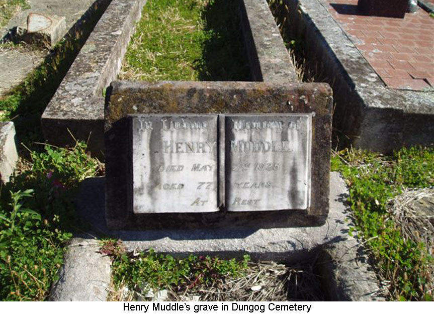 Henry Muddle married Mary Elizabeth Page, known as Elizabeth, at Inverell in New South Wales, which is about 220 miles north of Newcastle near the boarder with Queensland, on 7 March 1870. They had ten children born between 1870 and 1890. Their first child was born at Inverell in June 1870 and Henry was then a labourer. They then moved to Dungog registration district in New South Wales, which is about 35 miles north of Newcastle, where they had nine children between 1872 and 1890. Henry was described as being a carrier when two of his daughters were buried in 1887 and 1888, and then as a farmer when his son Arthur died in 1929. He died in Dungog registration district on 7 May 1925, at the age of 77, and he was buried in the Anglican Section of Dungog General Cemetery. His grave is marked by an inscribed open-book headstone. Four years later Mary was living at Bendolba near Dungog when she died on 27 December 1929, at the age of 73 (not 75 as given on her burial record), and she was buried in St Peter's Church of England Cemetery at Bendolba on 28 December 1929. Administration of Mary's estate valued it at £459. Most of this must have been the property she owned in Bendolba that was valued at £450 and consisted of just over 3 acres of land on which there was a six room house of weather board and iron roof construction.[1]