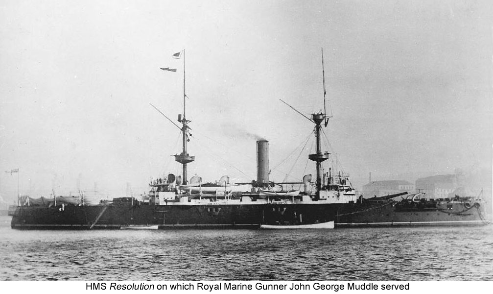 George and Eliza’s only child was George Muddle who was born at Sutton Valence in Kent on 24 July 1845, and baptised at St Mary’s Church in Sutton Valence on 17 August 1845. His father died just seven months after his birth. In the census of 30 March 1851 George, at the age of 5, was a pauper in the Maidstone Union Workhouse School; his mother and young sister were also paupers in Maidstone Union Workhouse. On 11 May 1860 when he was nearly 15 years old, though he said he was 15, George enlisted in the Royal Marines at Chatham for 15 years. He was enlisted by Sergeant Major Lane who gave him free kit as his bounty. George’s enlistment papers describe him as 4ft 11ins tall with a ruddy complexion, grey eyes, sandy hair, and to have no distinctive marks. George’s time in the Workhouse School must have done some good as he could write; he signed his attestation papers clearly as George Muddles, which was the name he was known by on all his Royal Marines’ records. George served as a Drummer in the 113 Company of the Chatham Division of the Royal Marines. He first served 1 year and 234 days on shore before serving 1 year and 3 days afloat on HMS Wellesley. He then had 133 days on shore before serving afloat on HMS Columbine for 4 years and 251 days. He then had 3 years and 218 days on shore, during which he was recorded in the census of 2 April 1871 as being a 25-year-old Drummer in the Royal Marines at Chatham Barracks, before serving afloat on HMS Resistance and HMS Caledonia for 2 years and 43 days. The Caledonia was a Guard Ship in the Forth from 1872 to 1875, so that must have been where she was moored while George was on her. George then served 130 days on shore before, after having served a total of 13 years and 282 days, he was invalided out of the service on 17 February 1874 because of chronic hepatitis. Through out his service George’s conduct was always described as very good, and he had been awarded two Good Conduct Badges, the last on 17 August 1870.[7]